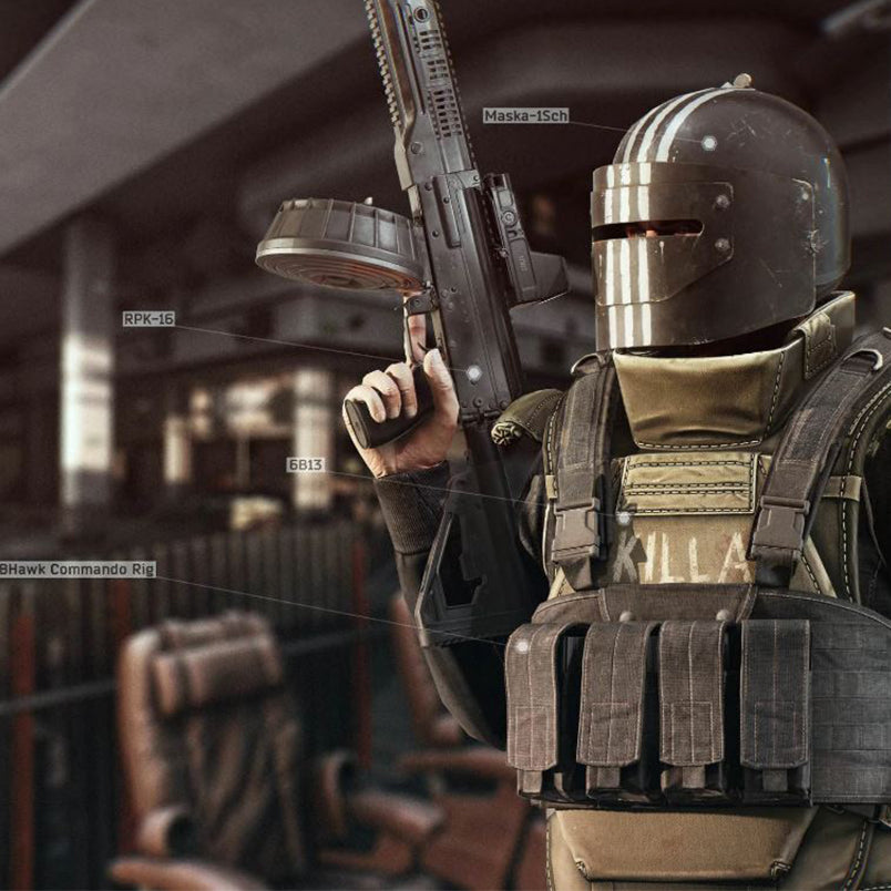 This vest is a detailed replica of the famous "Killa" armor from the game Escape from Tarkov —including a desert camouflage pattern and the "KILLA" logo on the front. The collar can be folded down for added comfort and secured with Velcro. The size is individually adjustable.