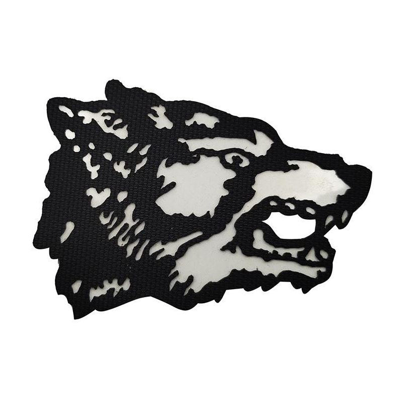 High-quality glowing wolf head velcro patch with velcro area on the back, ideal for attaching to dog harnesses, protective vests, backpacks or pouches.