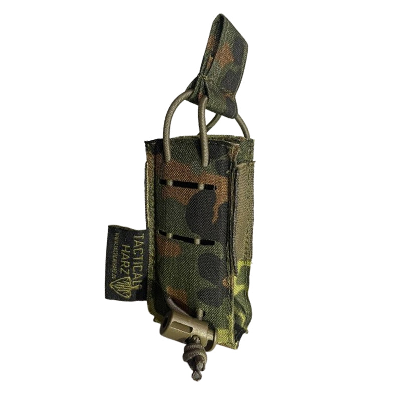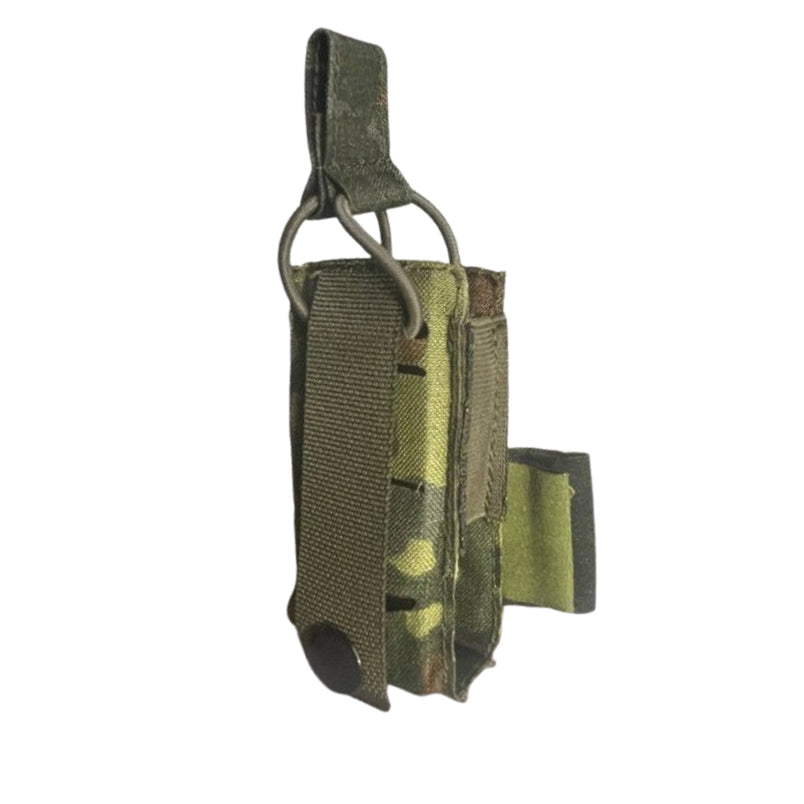 Das Magazin wird durch eine elastische Halteschnur mit verstellbarem Stopper sicher gehalten – auch bei Bewegung oder dynamischem Einsatz. Die Rückseite ist mit einer einzelnen MOLLE-Schlaufe und Druckknopf ausgestattet und lässt sich damit sicher an Battlebelts, Chest Rigs oder Plattenträgern befestigen – ohne viel Platz zu beanspruchen.